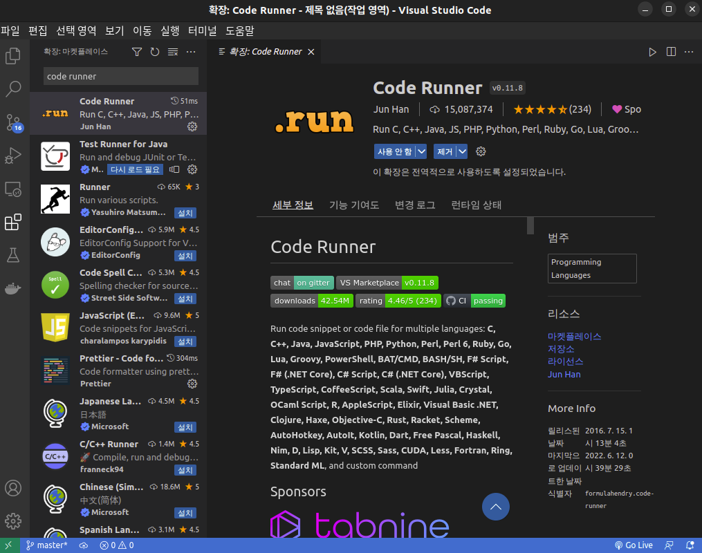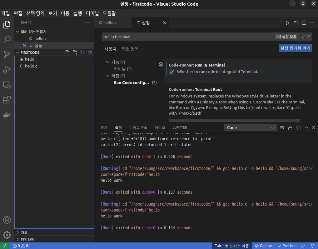 확장 프로그램 설치가 끝나고 나서 [파일] - [기본 설정] - [설정] 메뉴로 이동해서 검색할 수 있는 부분에서 run in terminal을 검색하세요. Whether to run code in integrated Terminal 부분을 체크해서 터미널에서 실행되도록 설정합니다.