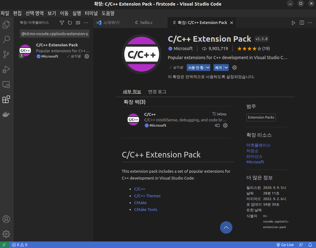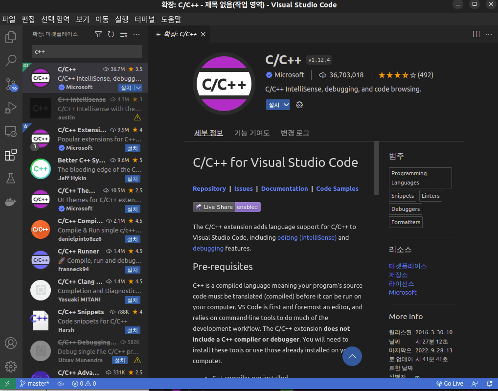 마지막으로 C/C++ 확장 팩도 설치하세요.